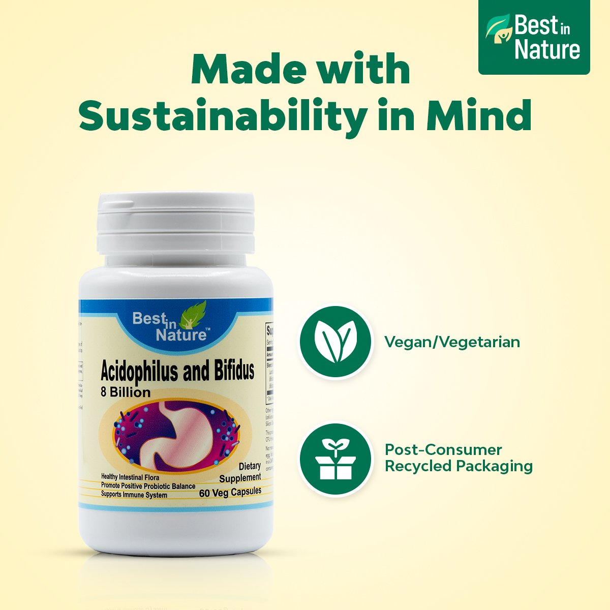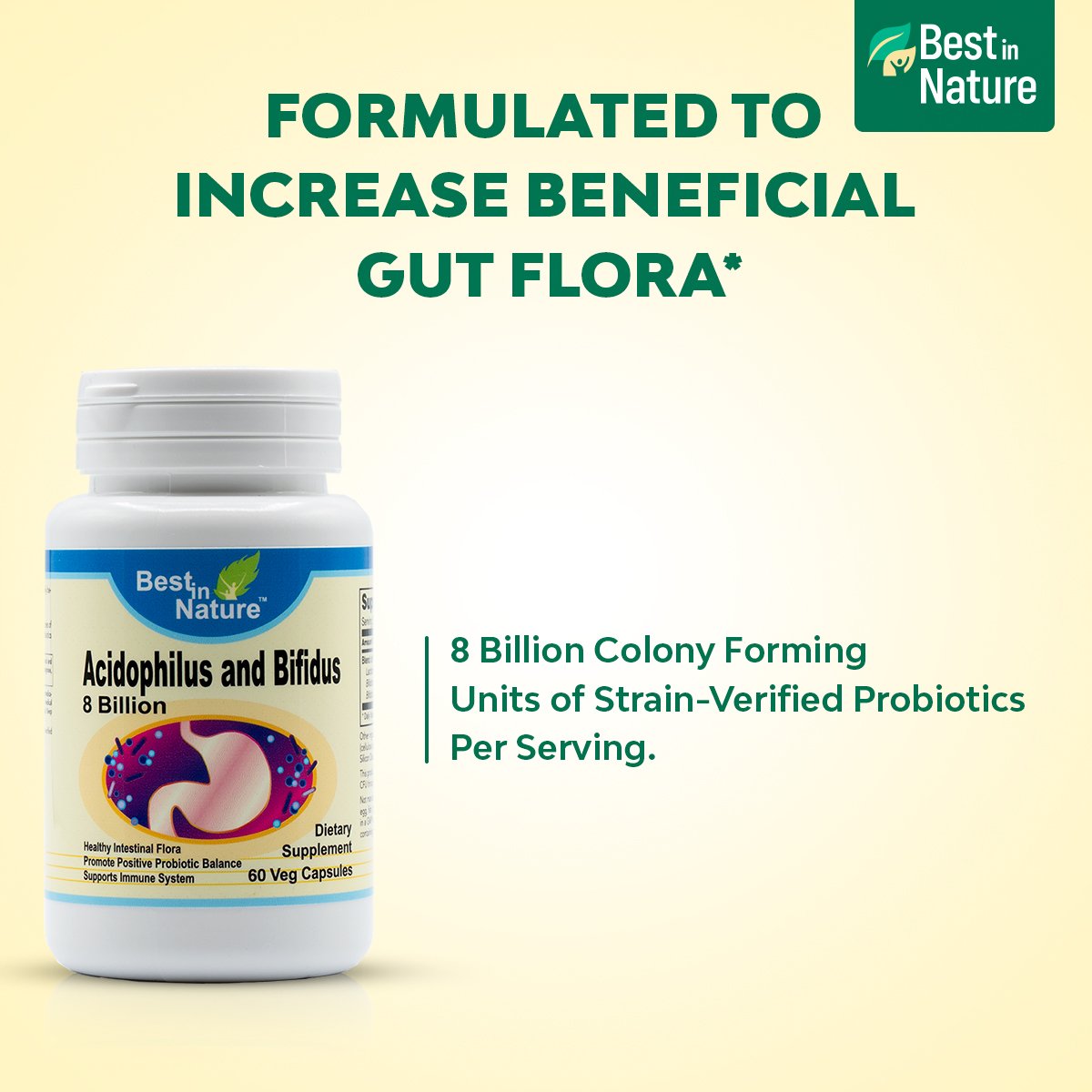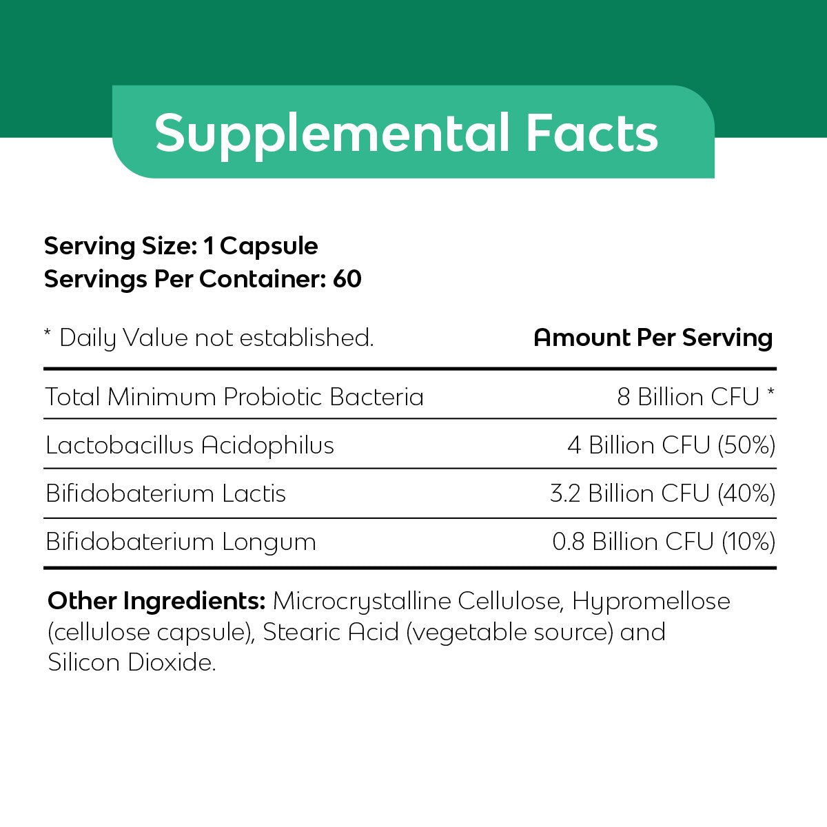 本产品旨在提供两种主要肠道常驻菌种的高效均衡混合。定期摄入有益益生菌有助于维持健康的肠道菌群。*