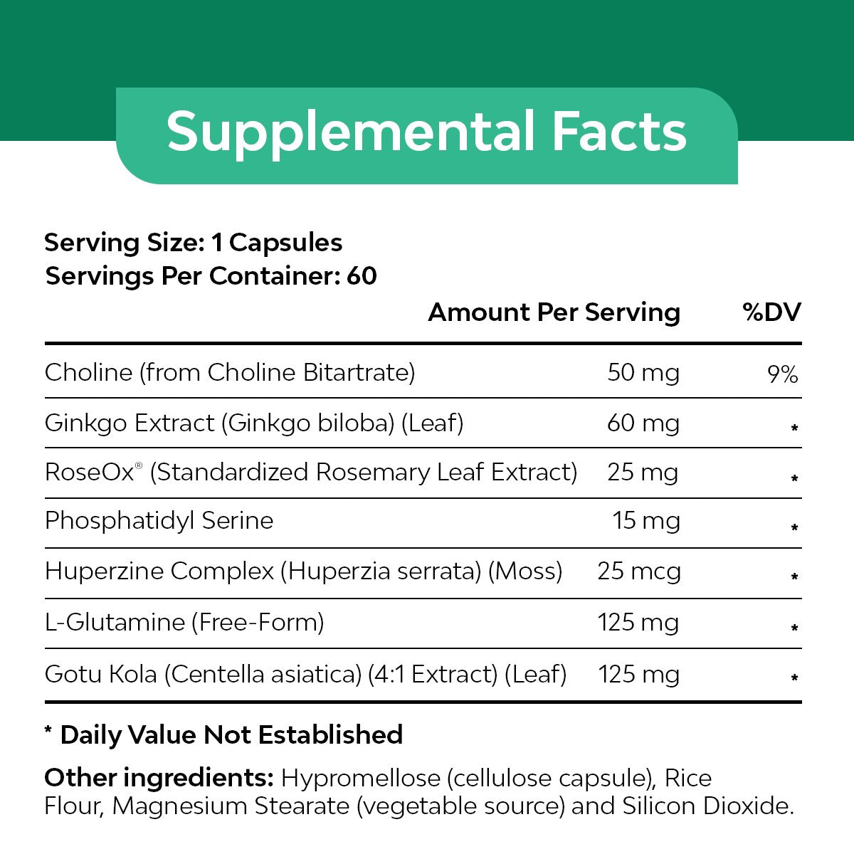 - 银杏提取物(60 毫克):改善大脑血液流动,增强记忆力、警觉性和认知功能。
