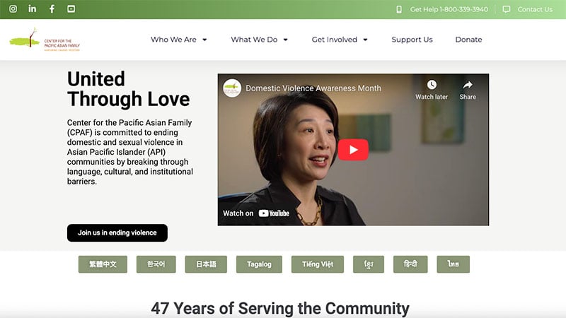 Center for the Pacific Asian Family provides a 24-Hour Crisis hotline available in 30 Asian and Pacific Islander languages, transitional & emergency shelter, counseling, and case management.
